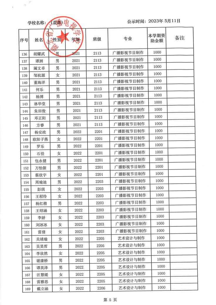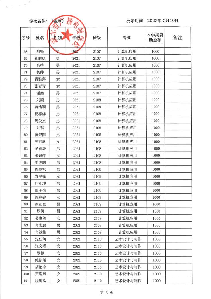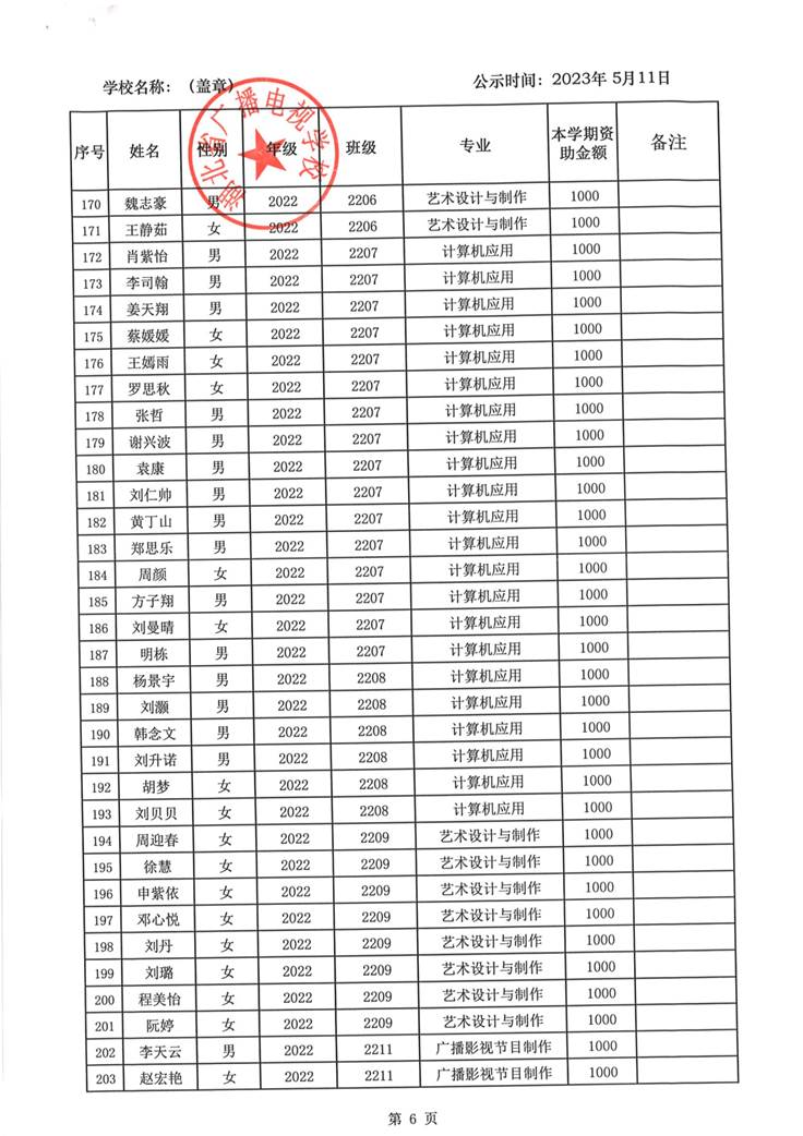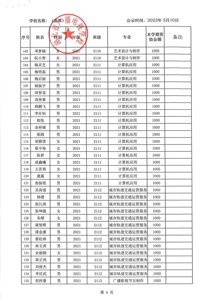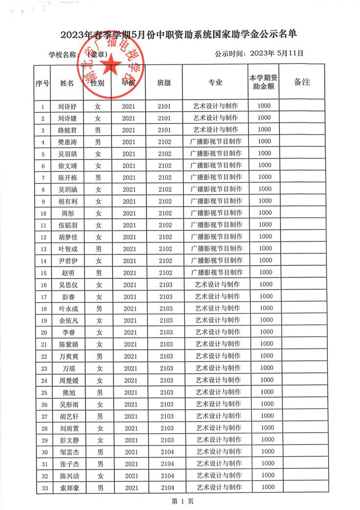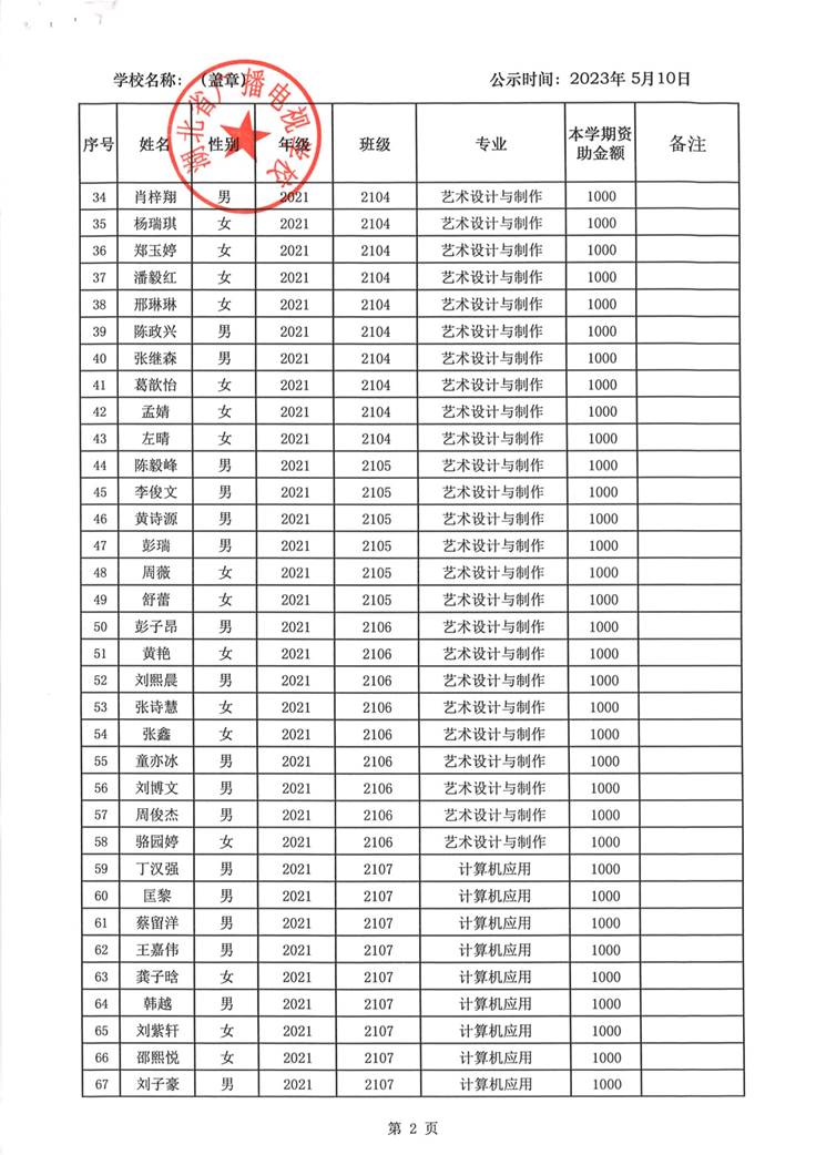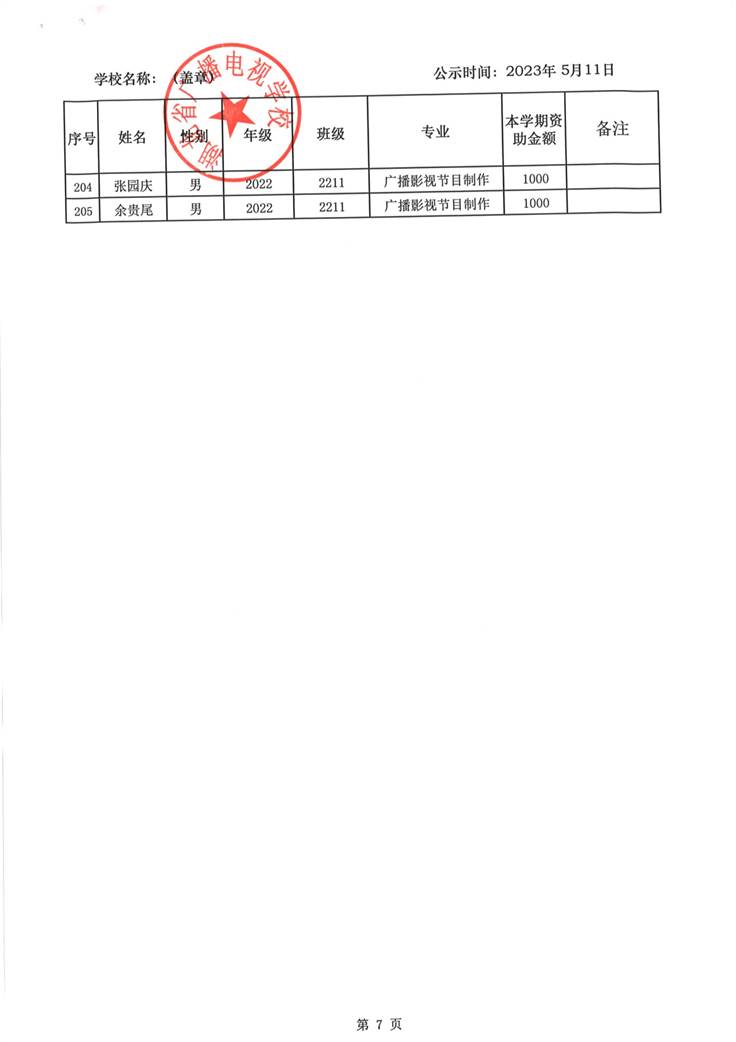我校于2023年5月15日至2023年5月19日对2023春季学期国家助学金受助学生名单(共205人)进行了公示。公示期间,未收到对以上受助学生的投诉,无异议,全部符合资助条件。现将受助名单公开发布,具体名单附后。