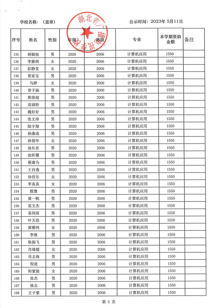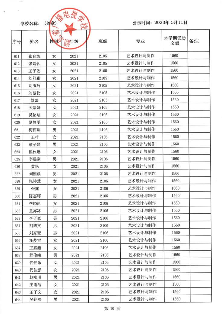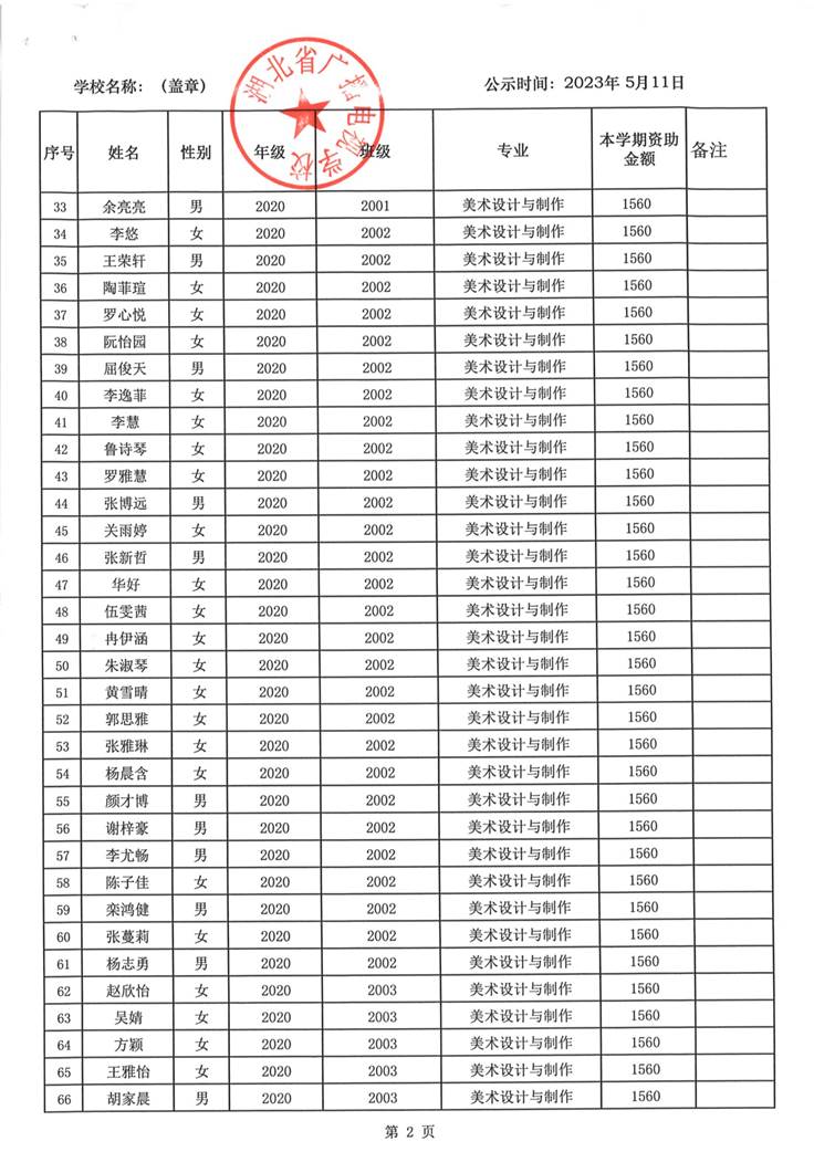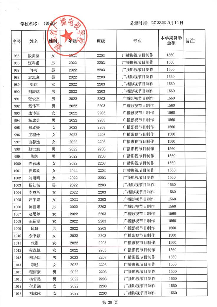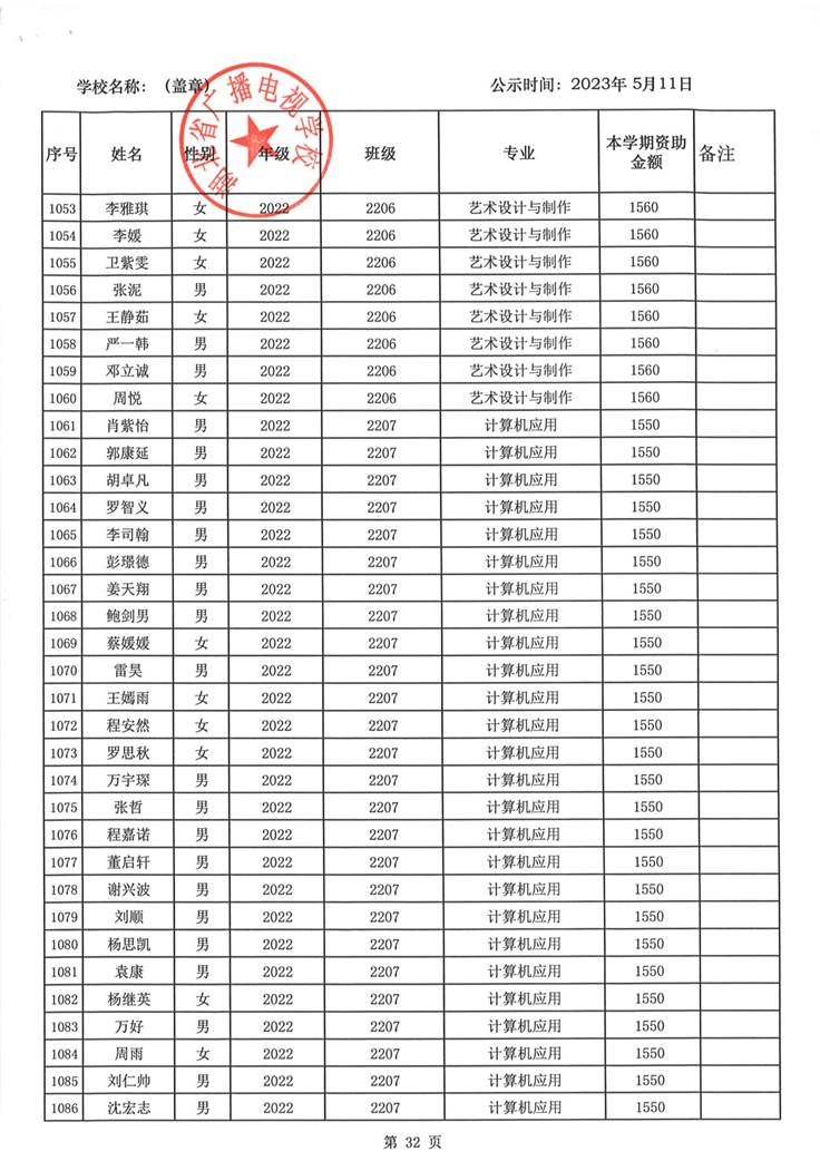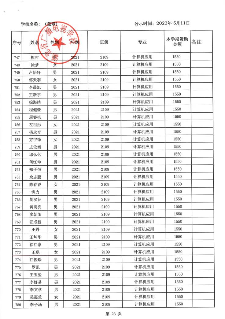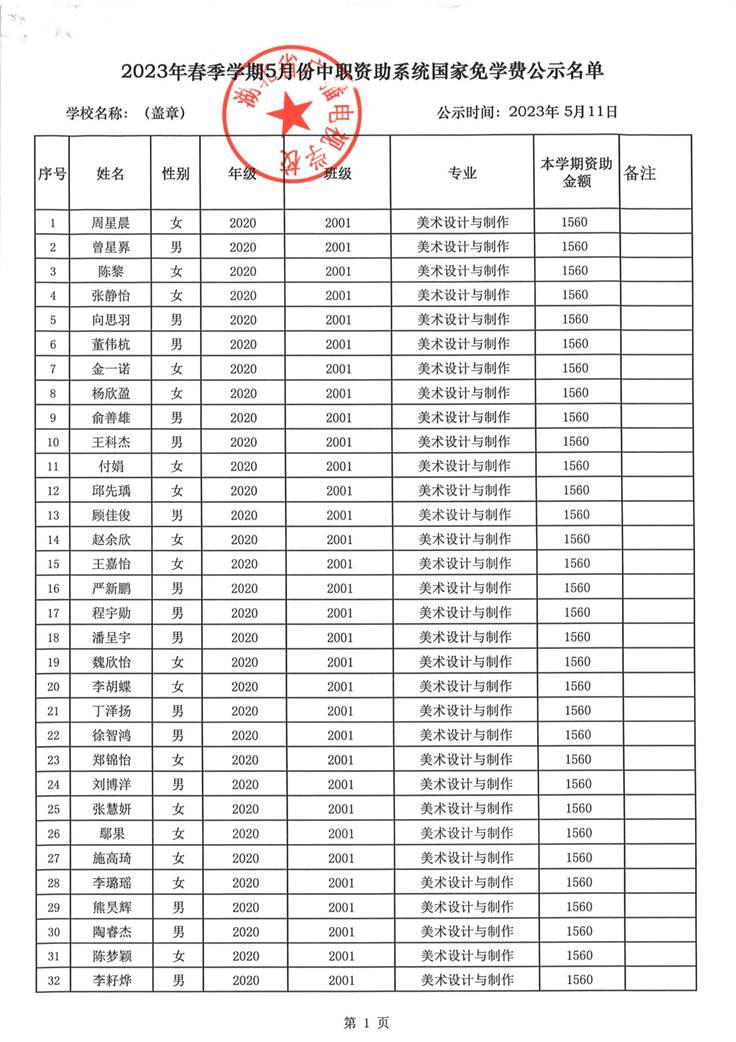 我校于2023年5月15日至2023年5月19日对2023春季学期国家免学费学生名单(共1188人)进行了公示。公示期间,未收到对以上受助学生的投诉,无异议,全部符合资助条件。现将受助名单公开发布,具体名单附后。