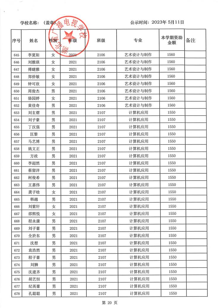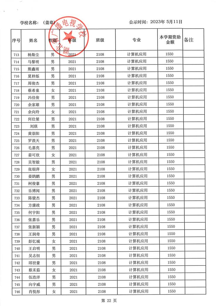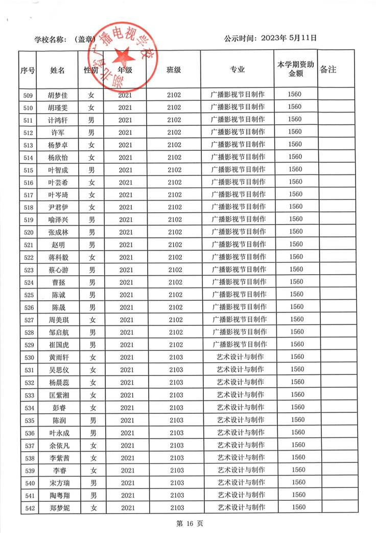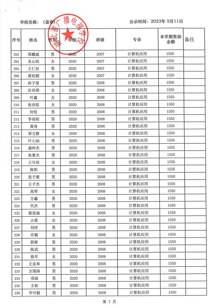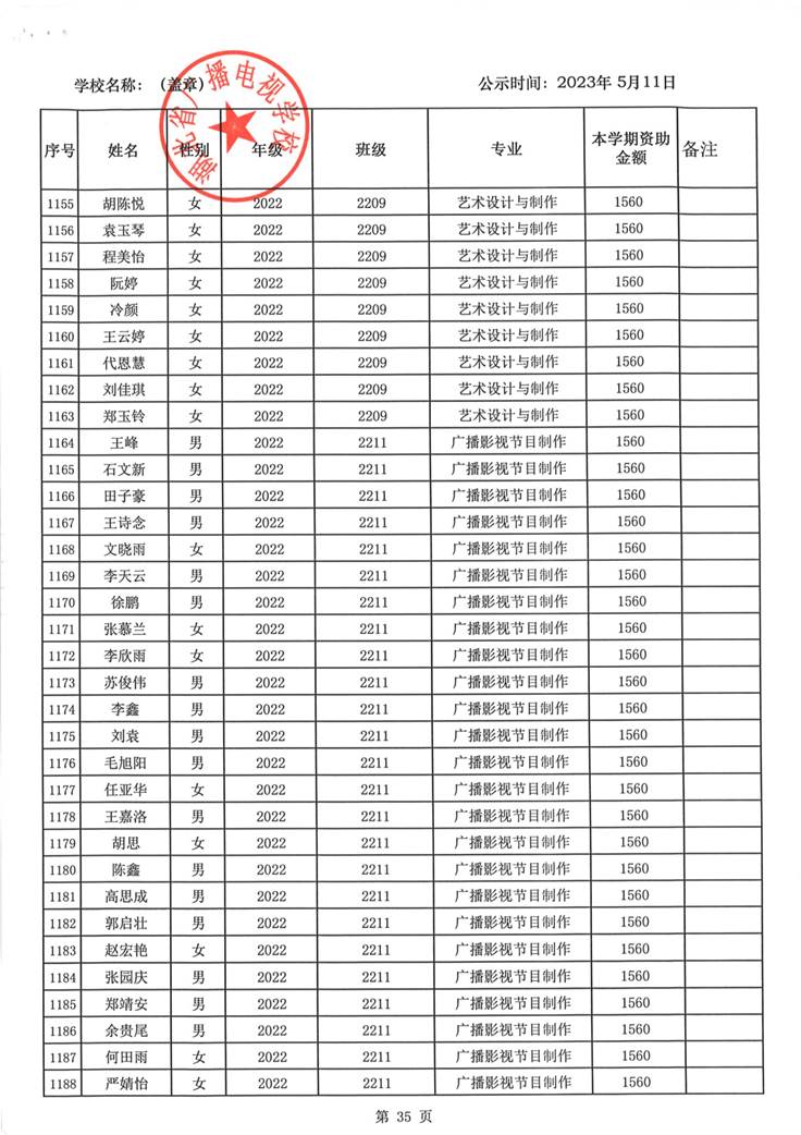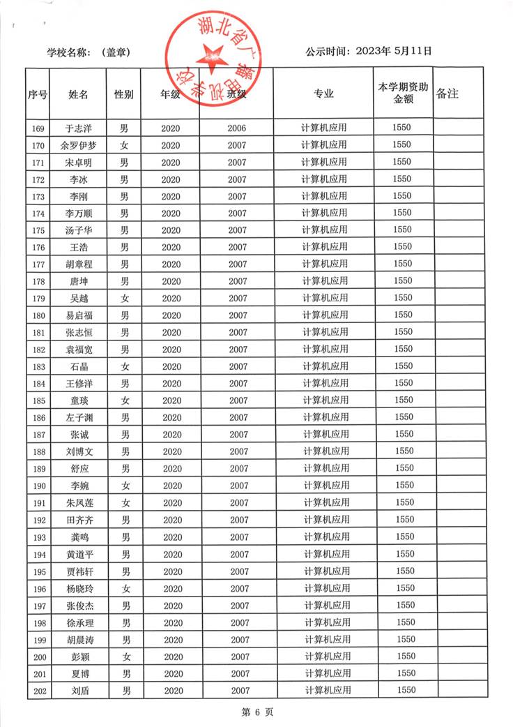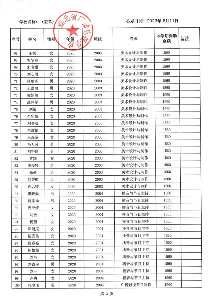 我校于2023年5月15日至2023年5月19日对2023春季学期国家免学费学生名单(共1188人)进行了公示。公示期间,未收到对以上受助学生的投诉,无异议,全部符合资助条件。现将受助名单公开发布,具体名单附后。