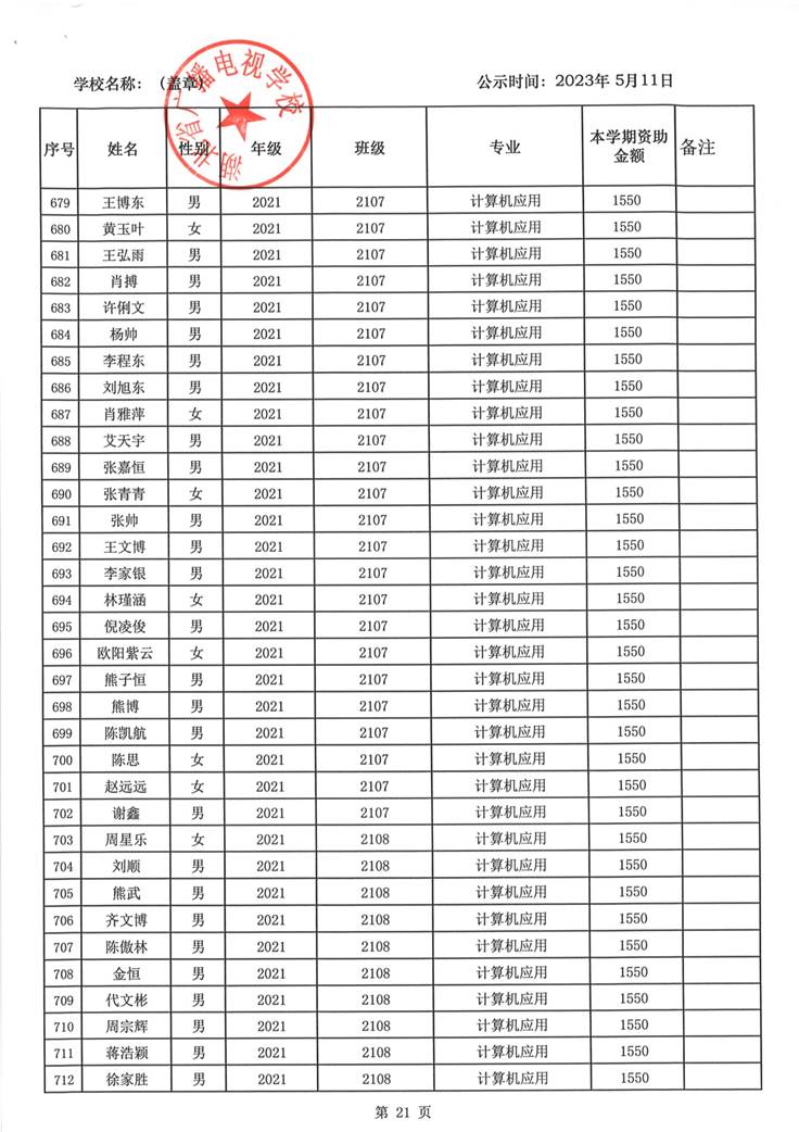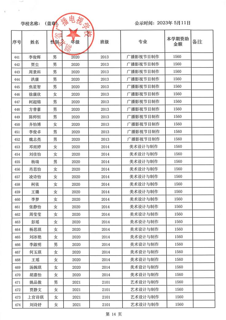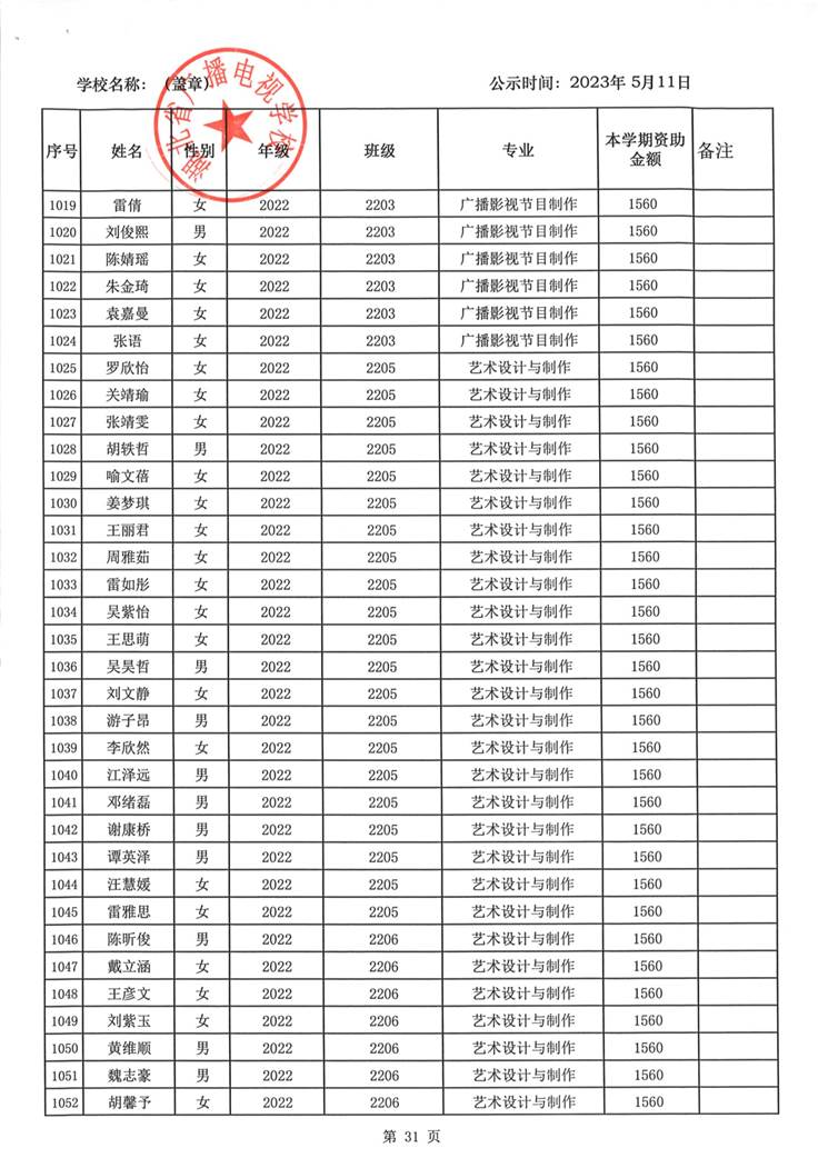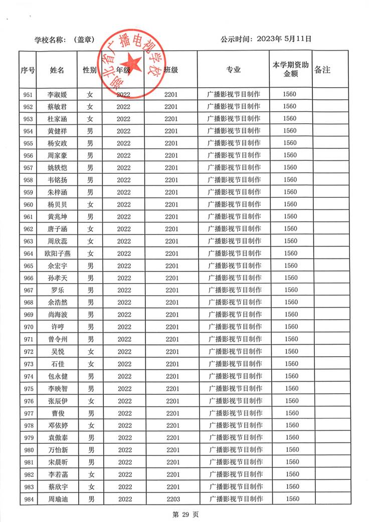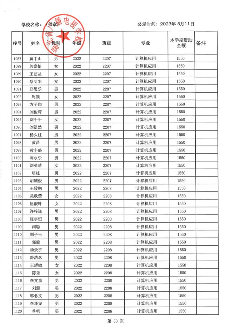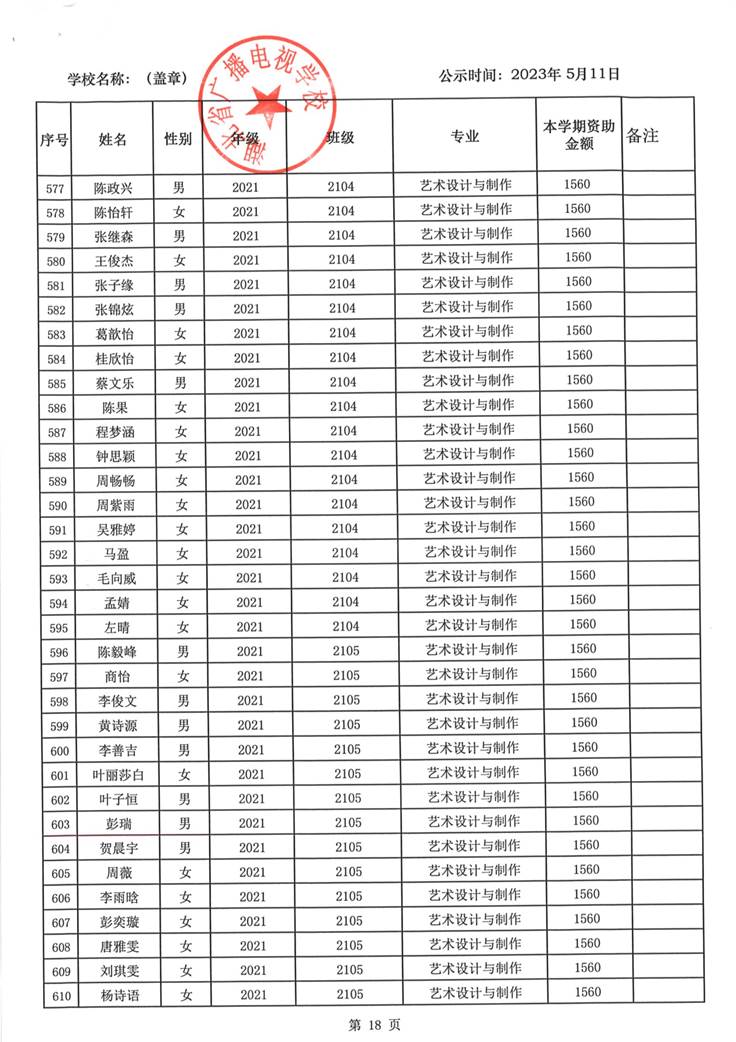 我校于2023年5月15日至2023年5月19日对2023春季学期国家免学费学生名单(共1188人)进行了公示。公示期间,未收到对以上受助学生的投诉,无异议,全部符合资助条件。现将受助名单公开发布,具体名单附后。