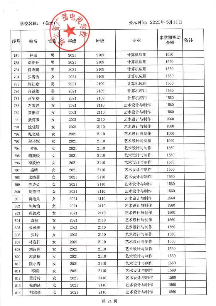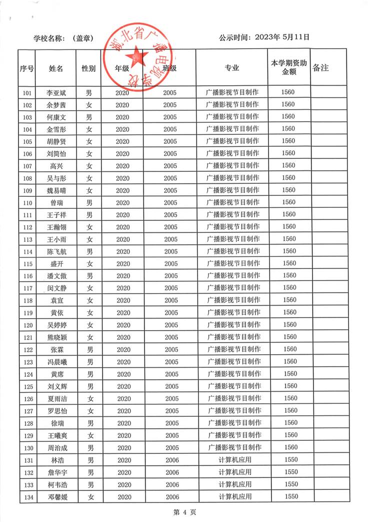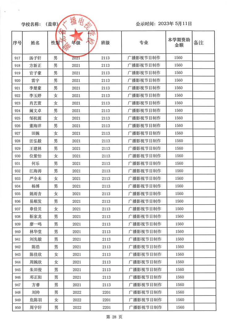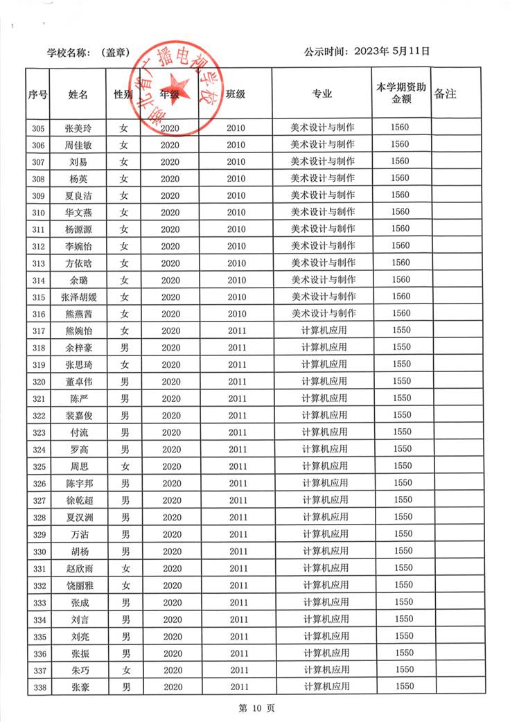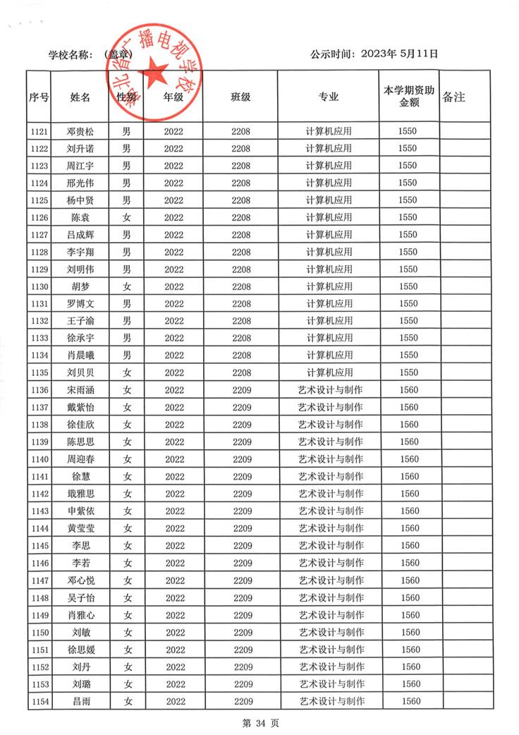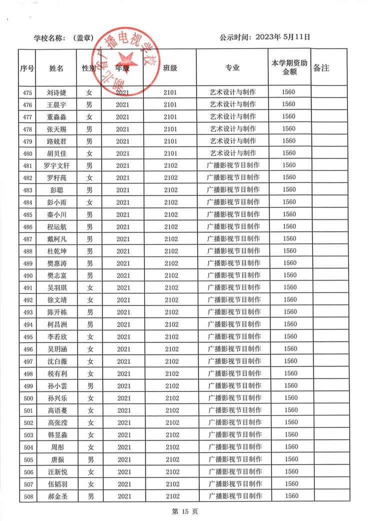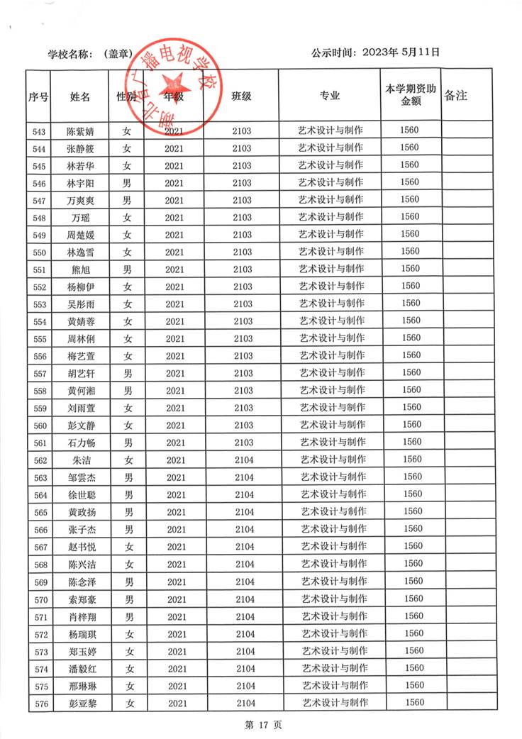 我校于2023年5月15日至2023年5月19日对2023春季学期国家免学费学生名单(共1188人)进行了公示。公示期间,未收到对以上受助学生的投诉,无异议,全部符合资助条件。现将受助名单公开发布,具体名单附后。