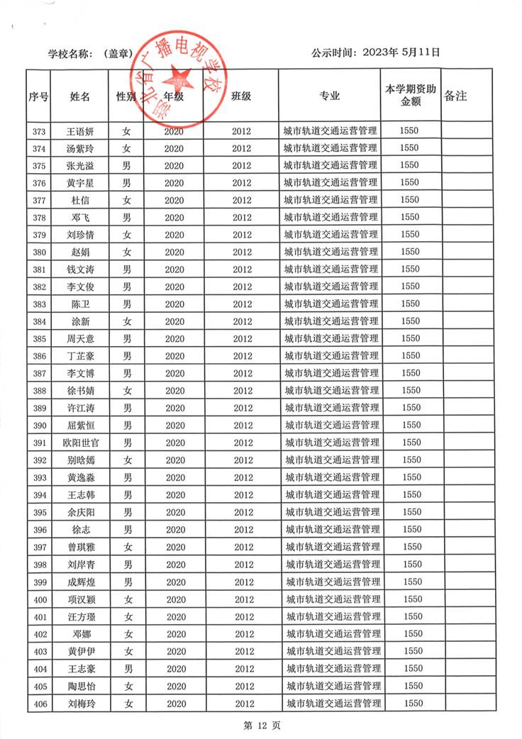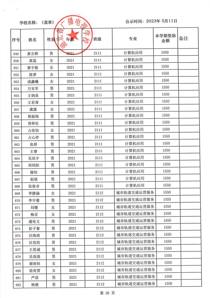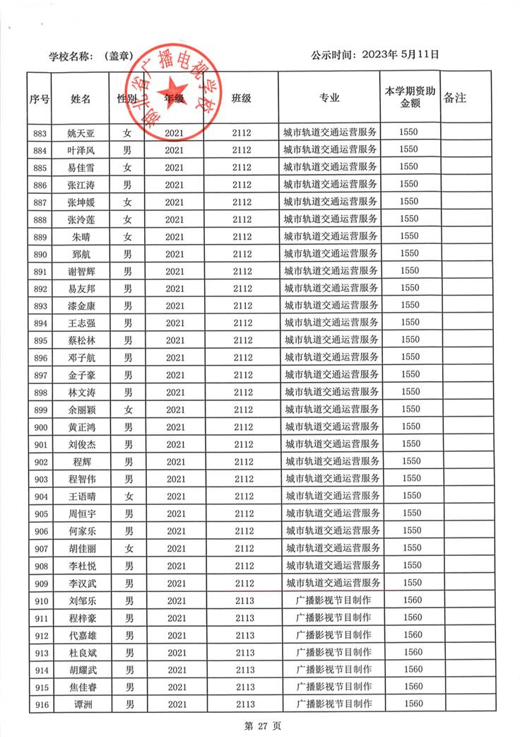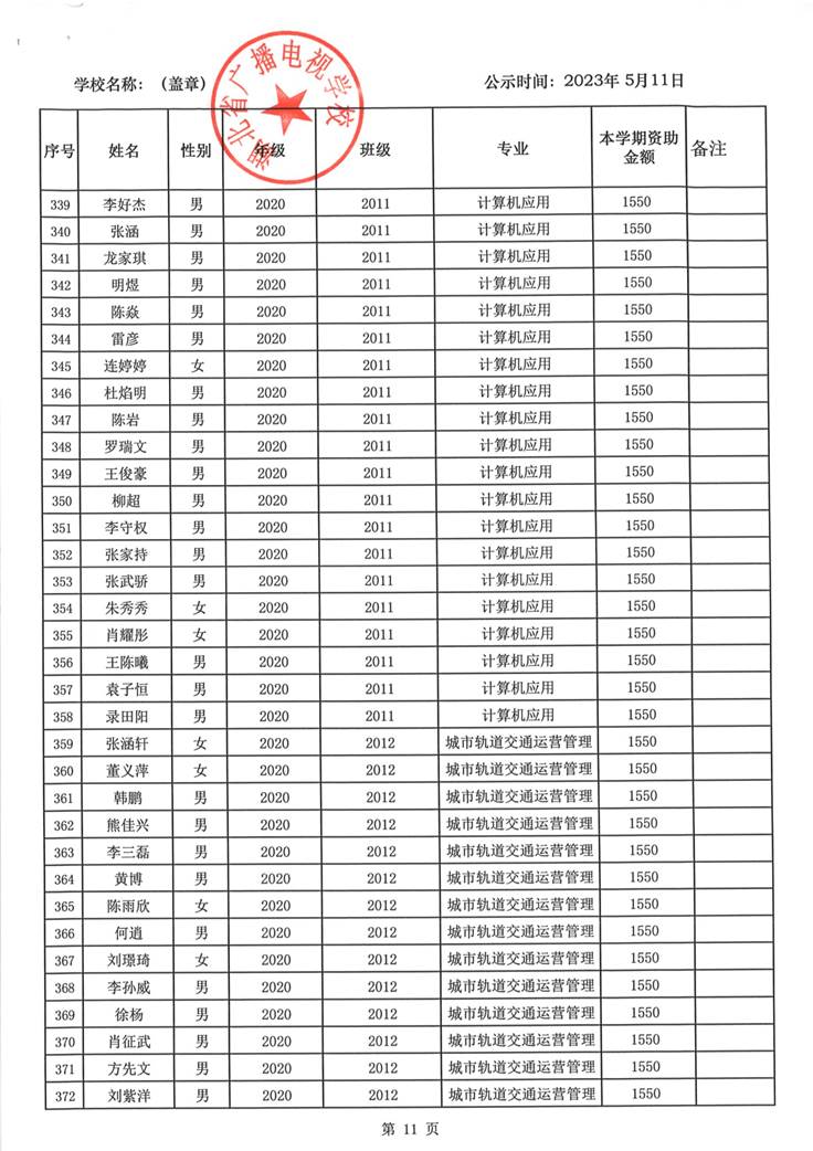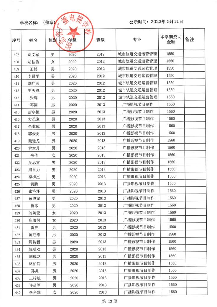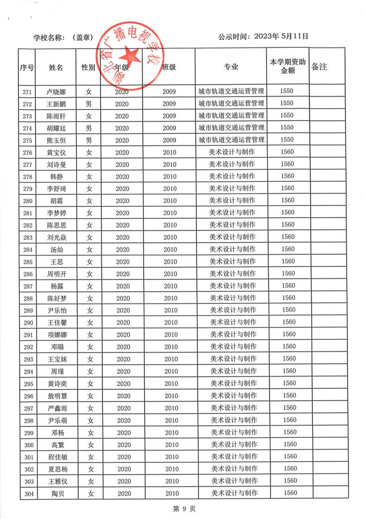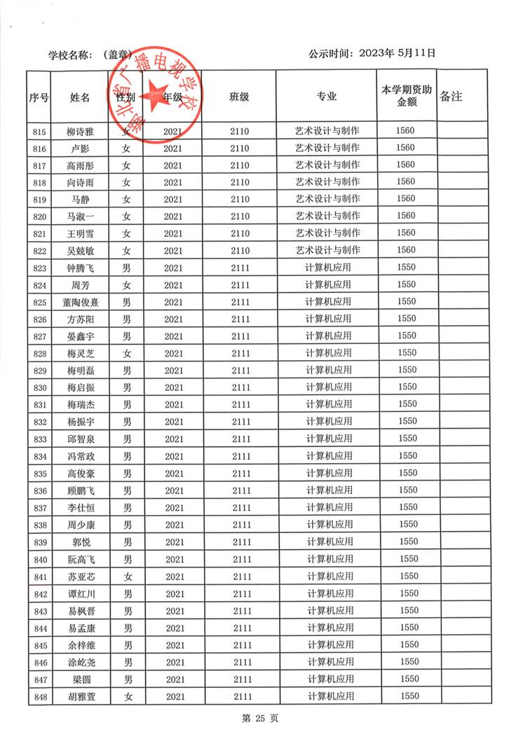 我校于2023年5月15日至2023年5月19日对2023春季学期国家免学费学生名单(共1188人)进行了公示。公示期间,未收到对以上受助学生的投诉,无异议,全部符合资助条件。现将受助名单公开发布,具体名单附后。